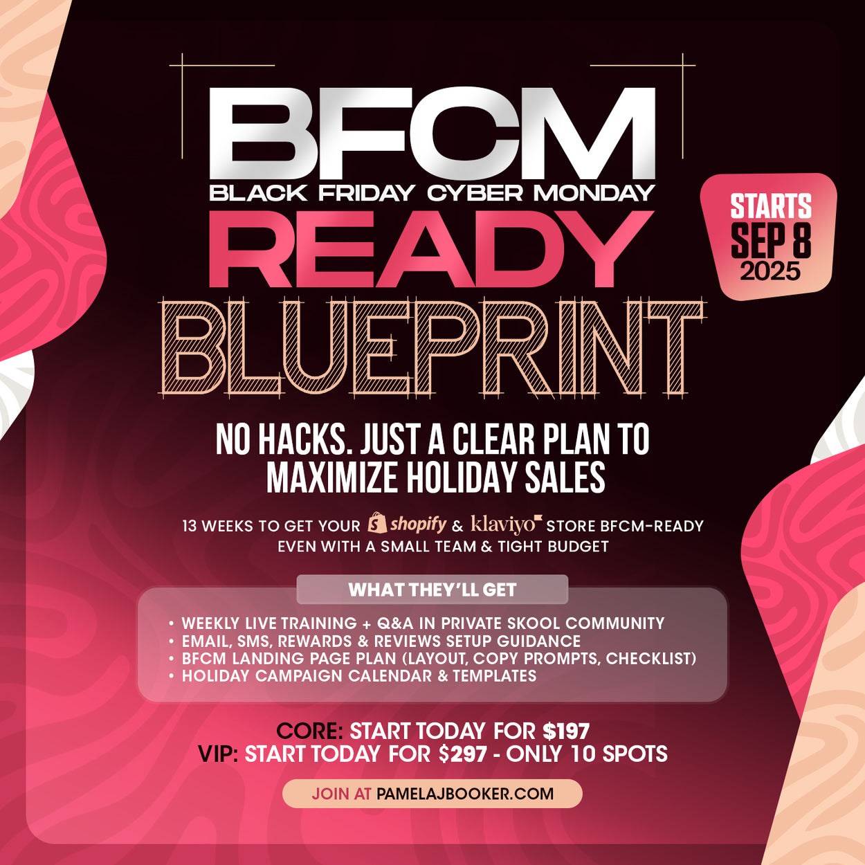 The BFCM Ready Blueprint – CORE program is a 13-week done-with-you experience designed to help Shopify store owners using Klaviyo get fully prepared for Black Friday–Cyber Monday.